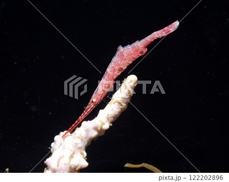 赤紫の棘のウニに住む鮮やかな小さいエビ|水中写真