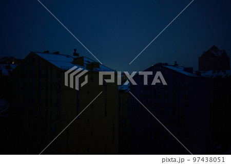 Light in one window in apartment multistorey building during the rolling blackout of electricity in a residential area of Kyiv after russian shelling.