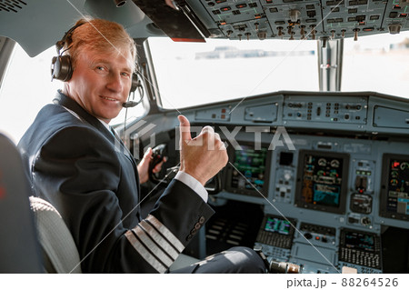 Male pilot sitting in airplane cockpit and giving thumbs up