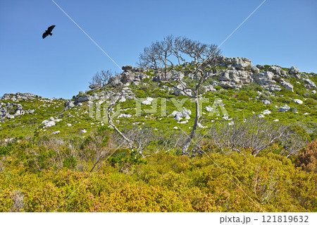 Landscape view of flowers, greenery, and plants on a mountain against a blue sky during summer in Cape Town, South Africa. Beautiful scenic view of a natural landmark on a sunny day with vegetation