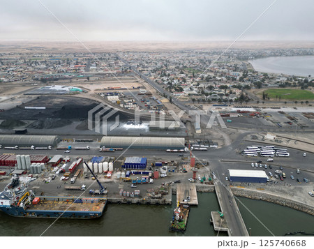 ナミビアのウォルビスベイの港湾風景の空撮