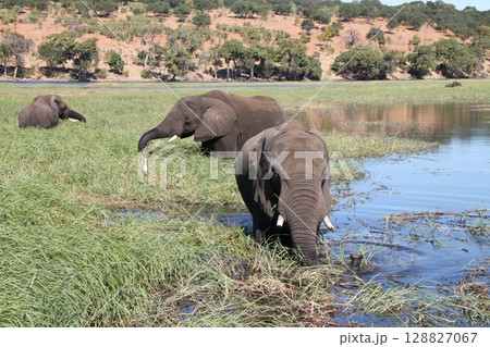 ボツワナ・チョベ国立公園の水辺に集うゾウたち