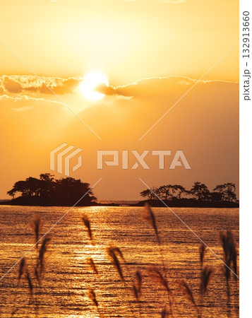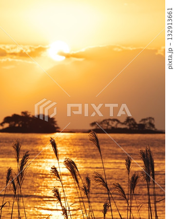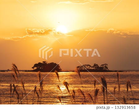晩秋の朝焼けに染まる富山湾と虻ガ島をススキ越しに臨む
