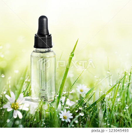 Clear liquid droplets falling from a dropper that can be used for cosmetic and medical images.