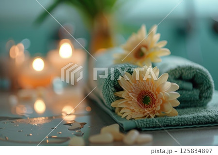 Chamomile Essential Oil with Towel and Daisy Flowers on Wooden Surface