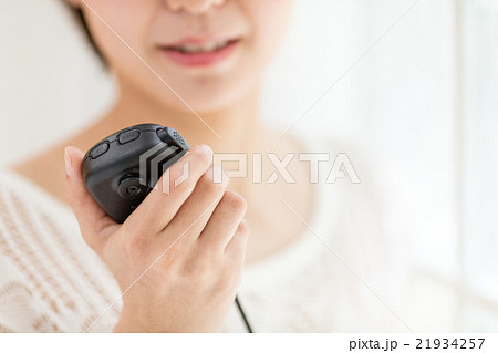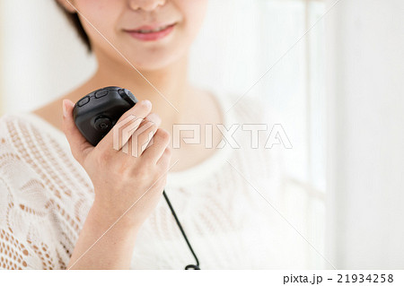 自治体の防災訓練で準備されたトランシーバーを使っての通信訓練に参加している男性
