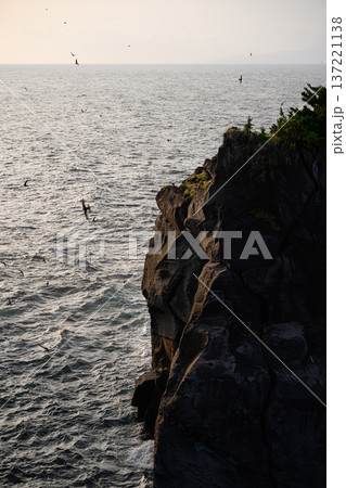 朝日に照らされた断崖と海岸を飛び回るアマツバメ 城ケ崎海岸の風景