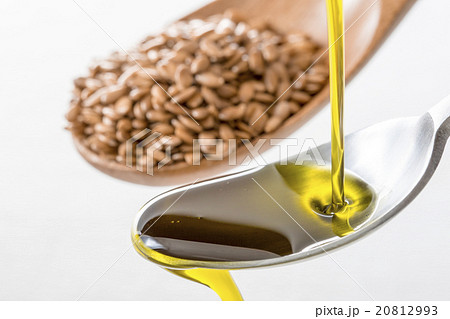 亜麻の種子から採られる植物油で、食用にも使われる亜麻仁油(アマニ油)のイラスト