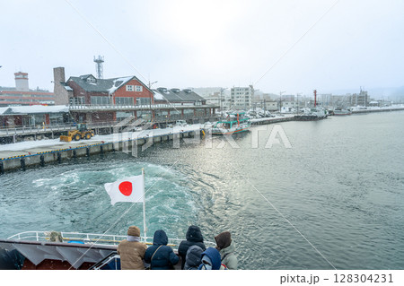 北海道網走市 雪の降る中、流氷観光砕氷船のおーろら号で流氷を見る観光客