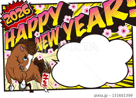 2026フォトフレーム年賀状「アメコミ風デザイン」ハッピーニューイヤー 手書き用スペース付パターン