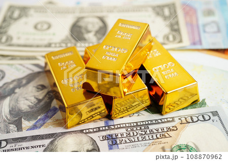 Gold bars on US dollar banknote money, finance trading investment business currency concept.
