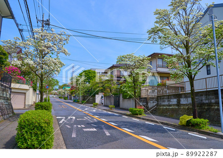ハナミズキが咲く川崎市麻生区 王禅寺五差路交差点付近の上麻生2丁目と王禅寺西1丁目の境界を北側に見る