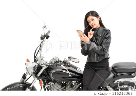 バイクに横座りしてスマートフォンで電話するバイク女子