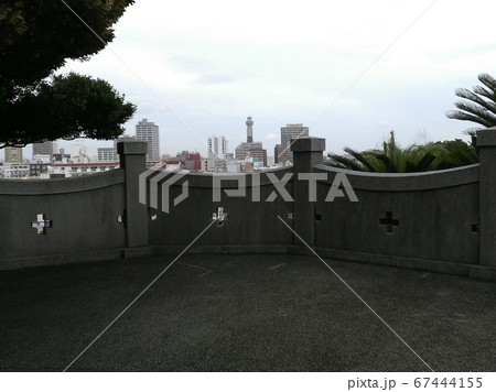 横浜 ブラフ18番館の十字模様のコンクリート塀から臨む景色