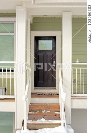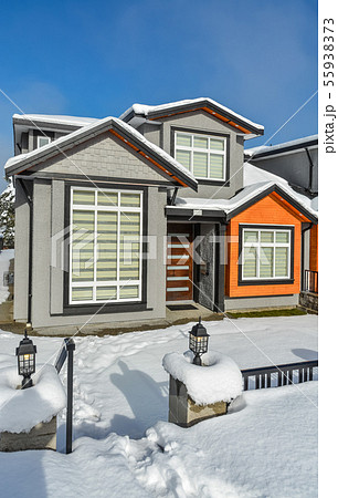 New family home for sale. New house in the suburbs on a sunny winter day.