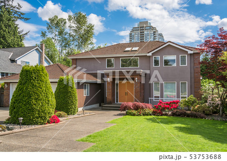 Luxury family house with luxury car parked on concrete driveway on sunny day