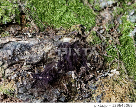 白い雪の結晶のような美しいツノホコリの群体が生えた倒木(自然環境下ストロボマクロ撮影)