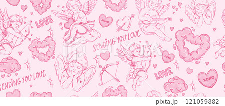 Valentine Day seamless pattern, vector watercolor cupid cute pink background, baby angel, cloud.
