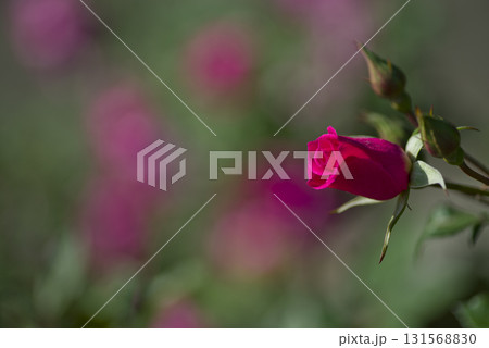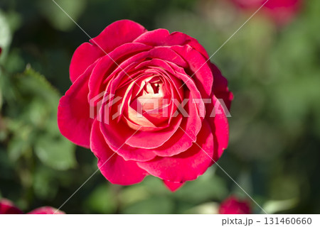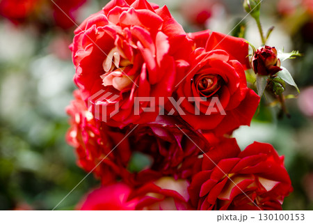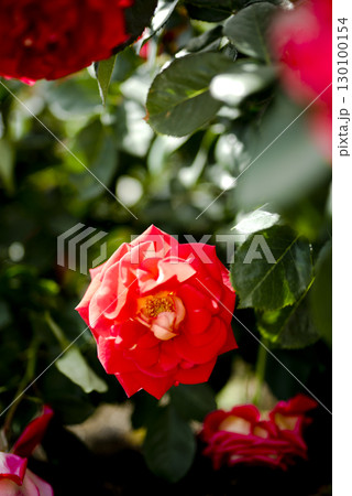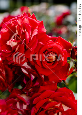 薔薇園に赤い薔薇の花が咲いています。このバラの名前はあやおりです。