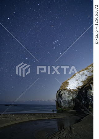 北海道白老町アヨロ海岸のポンアヨロ川河口とオリオン座と冬の大三角