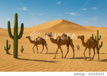 砂漠 青空 ラクダ サボテン ステンドグラス風