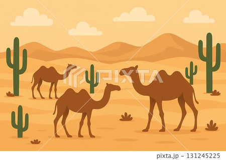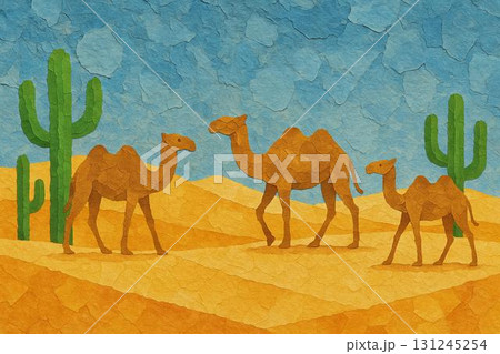 砂漠 青空 ラクダ サボテン ちぎり絵風