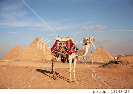 ピラミッドの横で疲れを癒すラクダ、砂漠の夕焼け