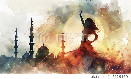イスラム宮殿を背景に踊る女性 AI画像