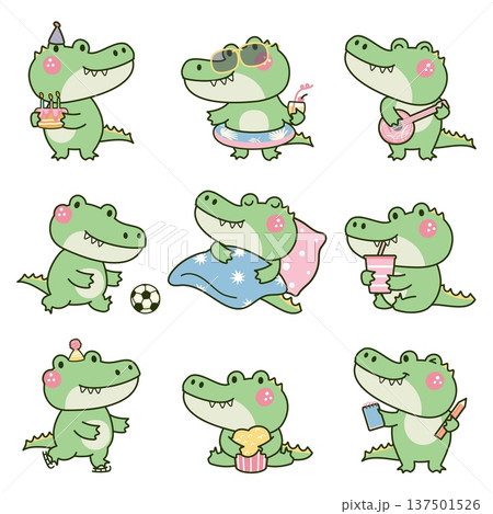 Kawaii crocodile. Cute crocodiles various poses. Wild animal play ball, music, sleeping, stand with birthday cake. Children mascots, funny stickers nowaday vector design