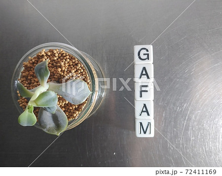 明るい日差しの中でGAFAと並べられたサイコロ文字と植物1