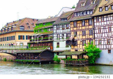 Strasbourg city historic centre, The Petite France Quarter with buildings colorful houses and Pont Saint-Martin bridge across River Ill canal in old town Centre, Alsace Grand Est region, France