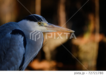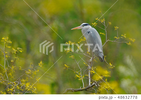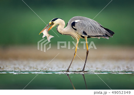 Grey Heron, Ardea cinerea hunting fish in fishpond