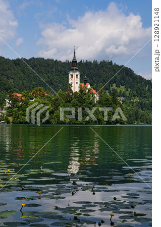 ブレッド湖に浮かぶ聖マリア教会と睡蓮