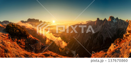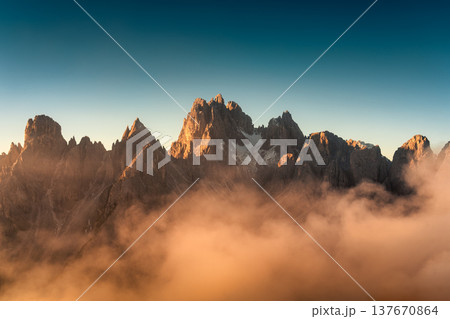 Majestic golden sunrise over mountain ridge and foggy in Cadini di Misurina, Dolomites, Italy