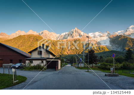Mont Blanc massif idyllic alpine landscape at sunrise, Chamonix, French Alps