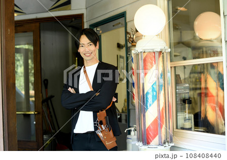 理容室の前で腕組みをする男性の理容師