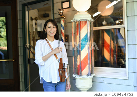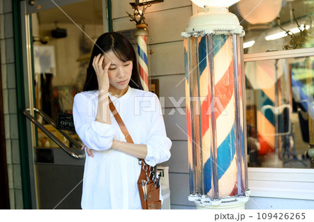 理容室の前で悩むアジア人の女性の理容師