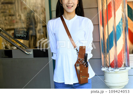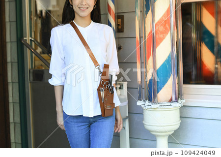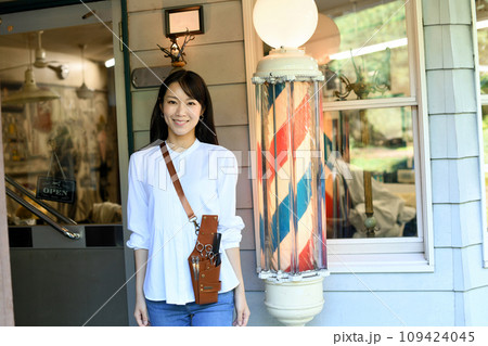 理容室の前で微笑む女性の理容師