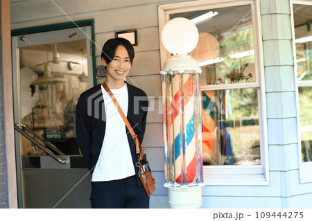 理容室の前で悩むアジア人の男性の理容師