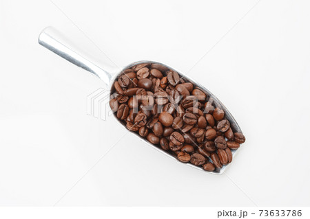Dark roasted coffee beans in metal scoop on a light background. Top view