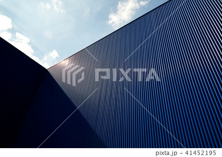 Modern industrial building facade made of corrugated steel panels with blue sky.