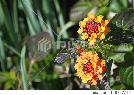 ランタナの蕾の上を這い回るナナホシテントウムシ
