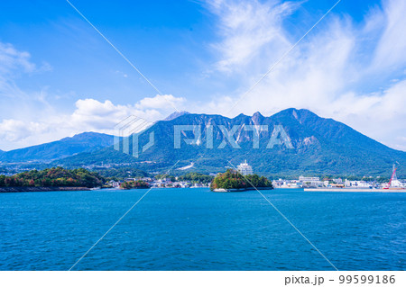 有明海から熊本県金峰山と熊本港パノラマ風景「熊本港から島原港(フェリー航海)」