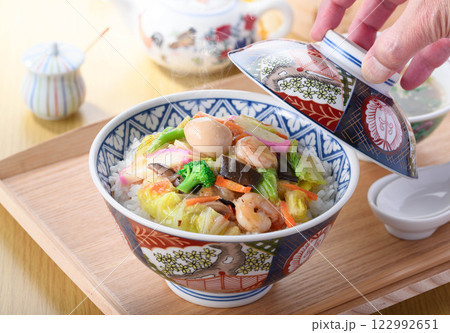 中華丼 白飯の上に八宝菜を盛りつけた日本式中華料理
