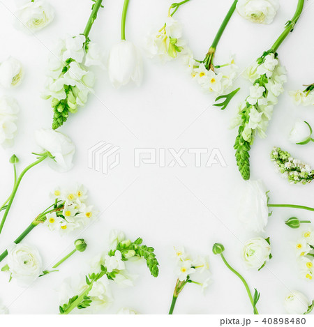 White snapdragon flowers on white background. flat lay, top view, copy space