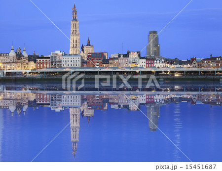 西ヨーロッパのベルギー アントワープを流れるエスコー川の対岸から朝焼けの市街地のシルエット