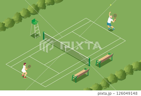 Isometric illustration of two diverse tennis players competing on a green outdoor court with net benches trees and umpire chair in summer sports setting