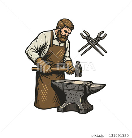 Blacksmith working with hammer and anvil in leather apron vector illustration