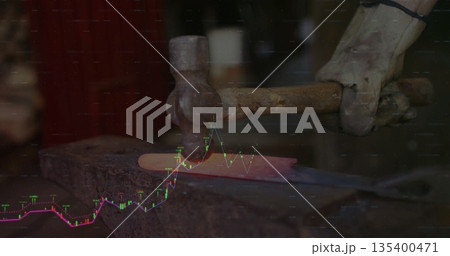 Senior blacksmith with protective gloves hammering hot billet on anvil at smithy with chart overlay