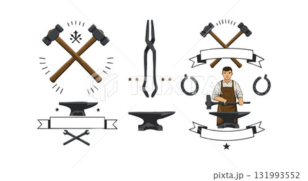 Blacksmith tools and worker vector illustration with hammers anvil and horseshoes
